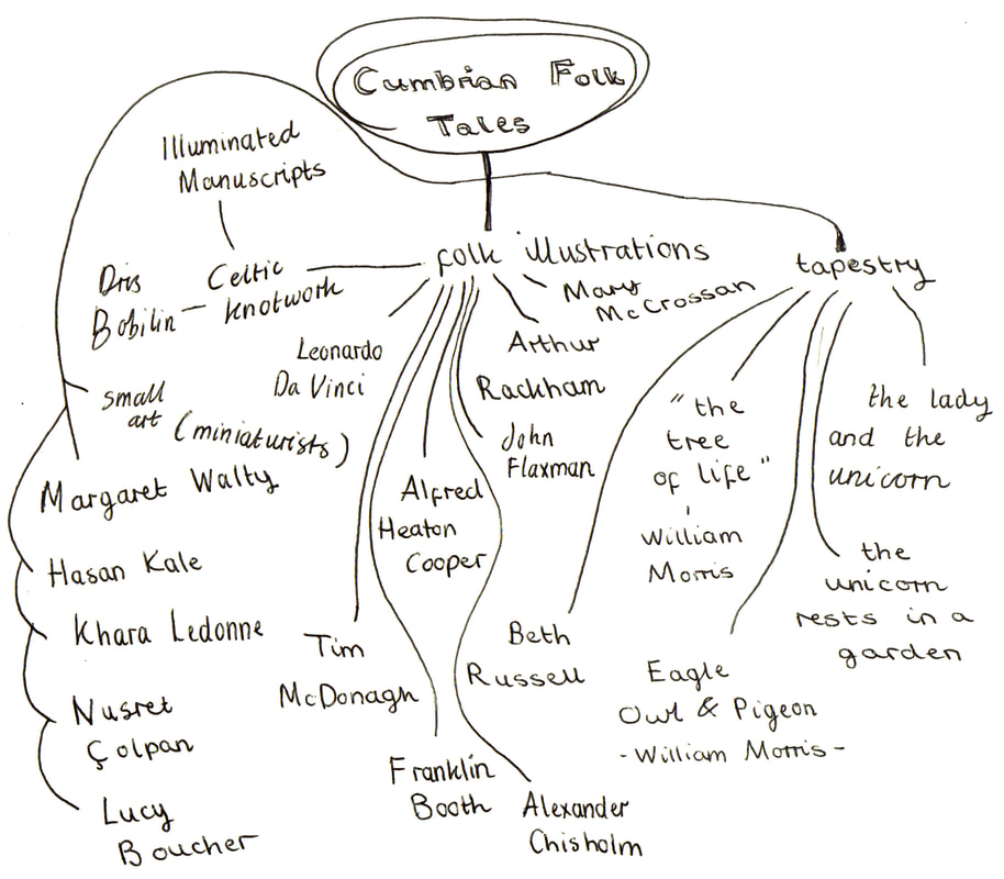Cumbrian Folk Tales After I decided upon Cumbrian Folk Tales as the topic for my stamp set I began to create a mind map of all the connections my brain made to this subject, from folk tale illustrators, miniaturists, illuminated manuscripts, tapestry and fabric art everything I thought of is on this sheet. I am going to use this to further my research going forward. |