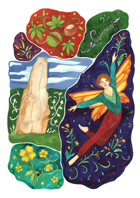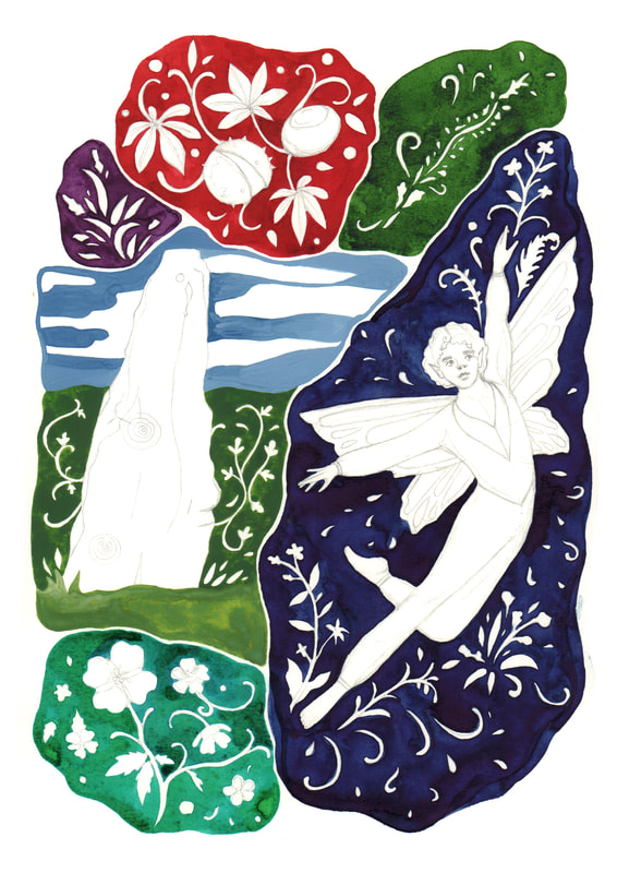 To create my final stamp designs I created a collection of elements to be combined, this consisted of a coloured ink, black and white ink and watercolour layer. My favourite is the coloured ink layer, because I really liked how the colours turned out, my favourites are Long Meg and the Cursing Stone because I think the composition in both of them worked the best out of the set.