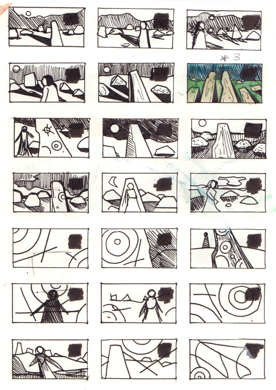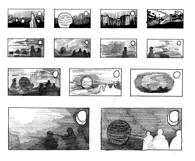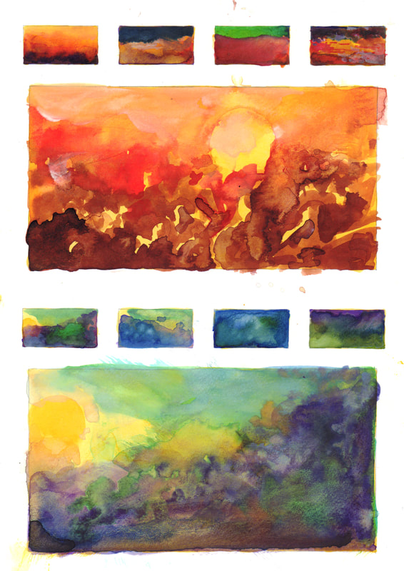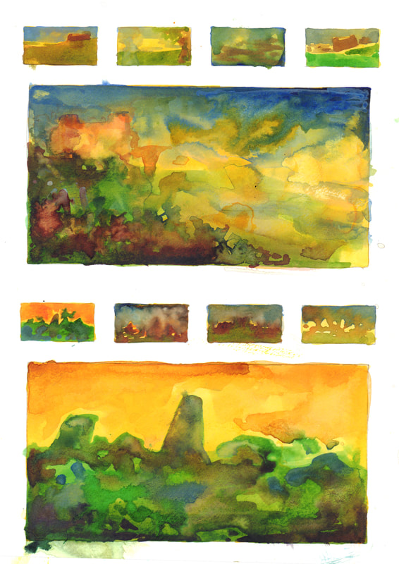 The previous painted compositions inspired me to create these development thumbnails to work out the composition and colour tone.