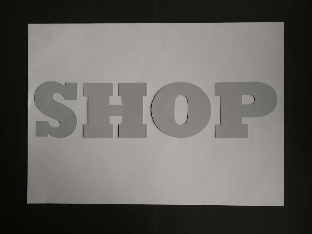 Cut the word SHOP out of thin grey card and mount it on a A3 sheet of white A3 cartridge paper.