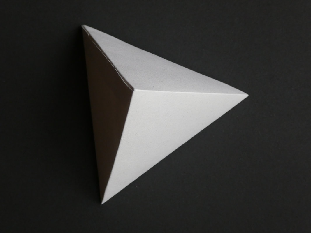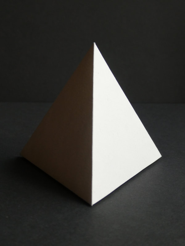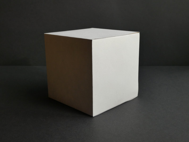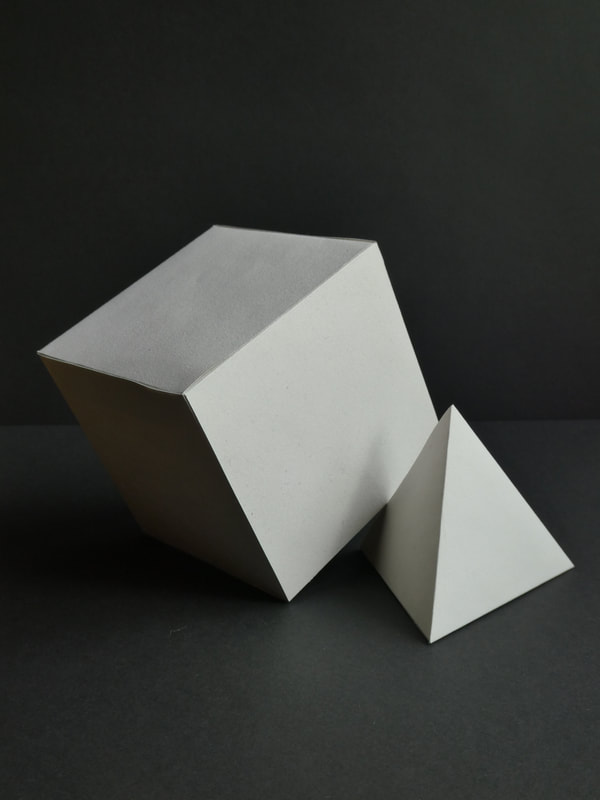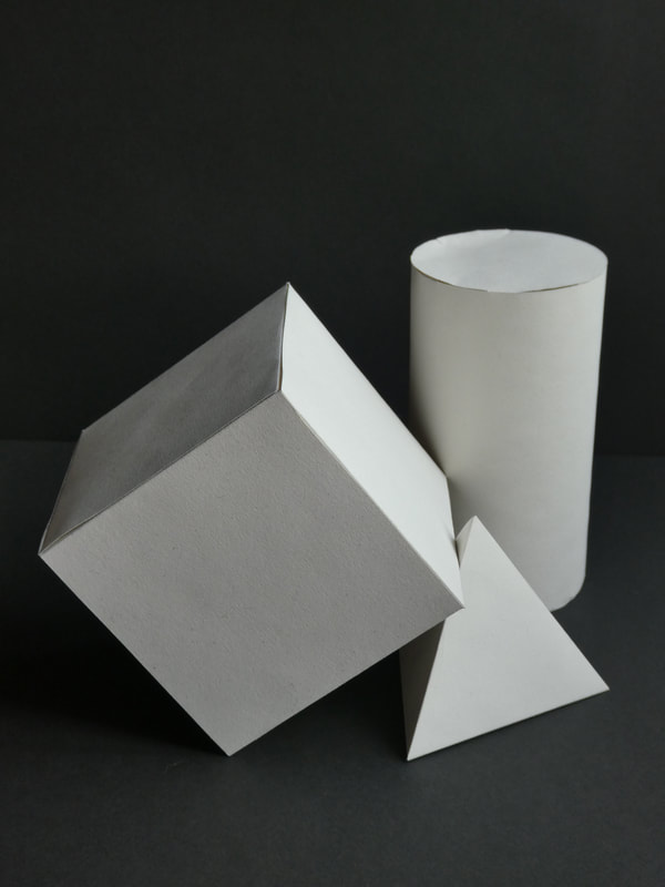 Using thick paper/thin card, create a perfect, white cube, cylinder and pyramid.