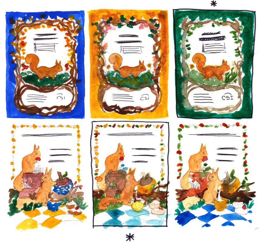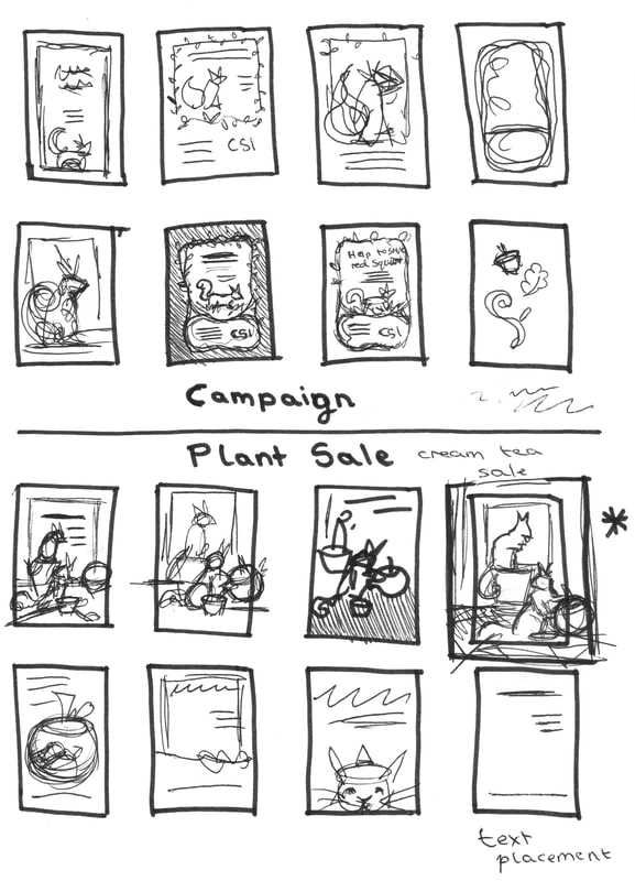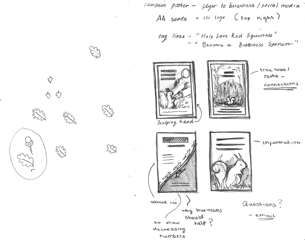 After showing these four thumbnails to Steve from "The Caldew Squirrel Initiative" we agreed that the top right idea fit with CSI the best. With the concept of trees and connections being at the forefront of the poster. This meeting also gave me a good idea of what text would need to be included within the poster so I knew what amount of space to leave free. I then went on to sketch some further small thumbnails to work out the subject and composition of my illustrations.