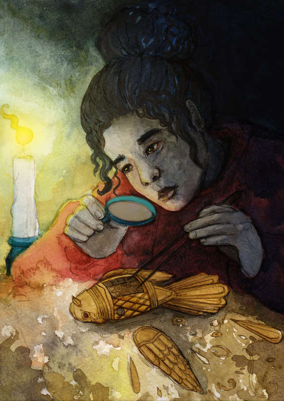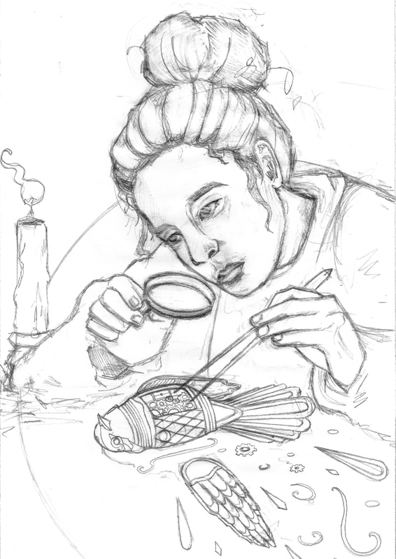 These are the outcomes of this project one cover and one interior page ideally I would have liked to do more. However this is a miniature project and the aim was always to do what I could just so I could escape and put my brain on something else for a little bit of time. I am quite pleased with how these designs turned out I always like gold and fabric on covers. I also found it I also found it interesting to draw a pose where a man was looking through a magnifying glass because it is a difficult pose to do and I don't think I've got it perfectly. But there's always time next time as I feel in my future I will actually come back to this project and build upon what I have.