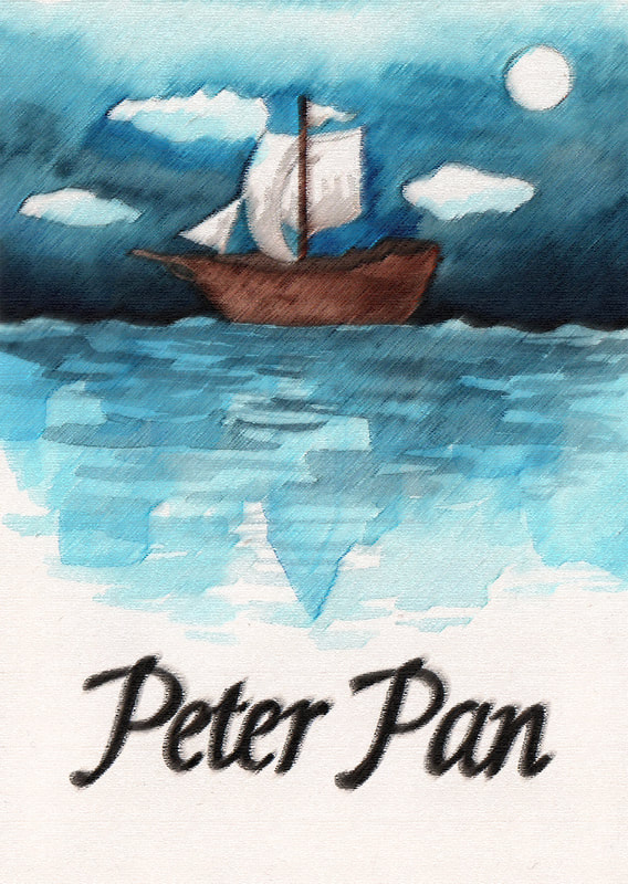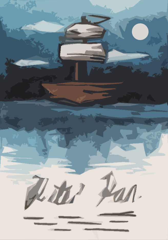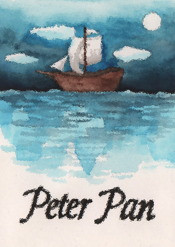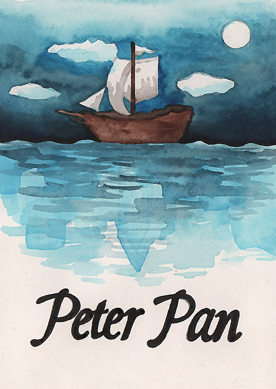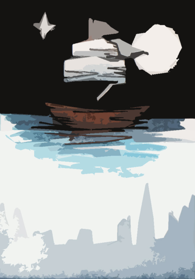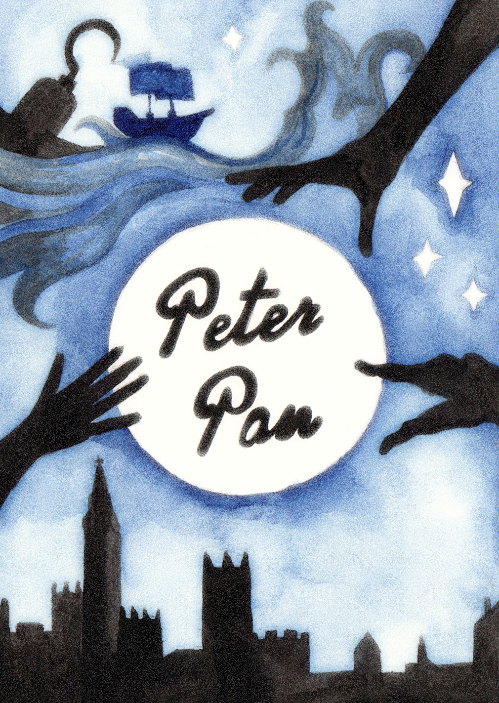 For the "Jolly Roger" development I tried to simplify the London skyline that is present in the water. I did really like the original boat that I had made using copic markers, however it looked more like a book cover than a theatre poster to me. Hence the reason why I decided to combine the two images. After testing how the marker and watercolour worked to create the appearance of water, I decided that I preferred the way that the watercolour looked. It was more fluidic which gave the piece more movement. However after these tests I decided that I didn't like the line art on the boat as it made the boat feel as though it was removed from it's environment.