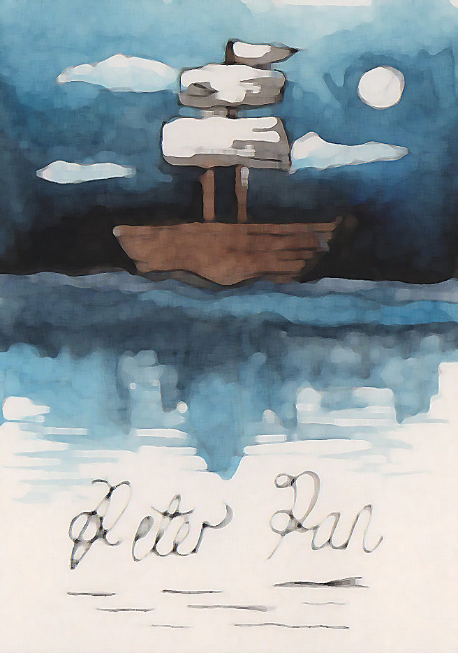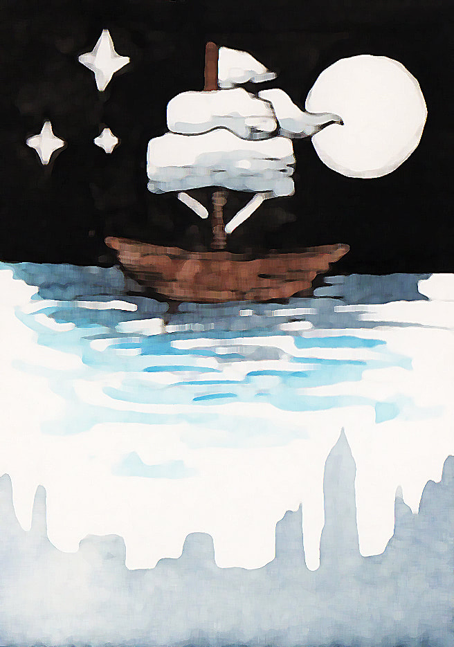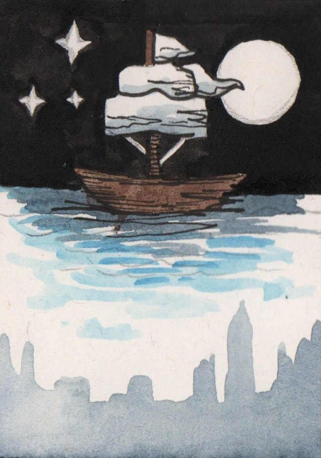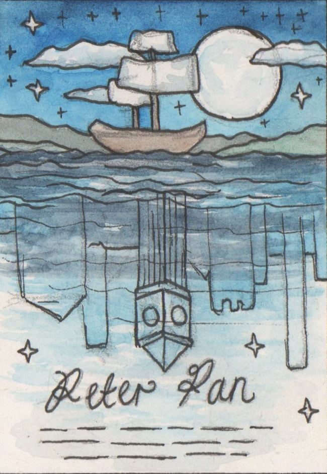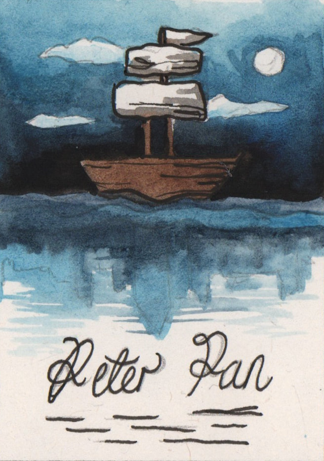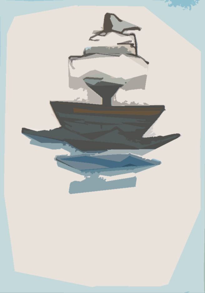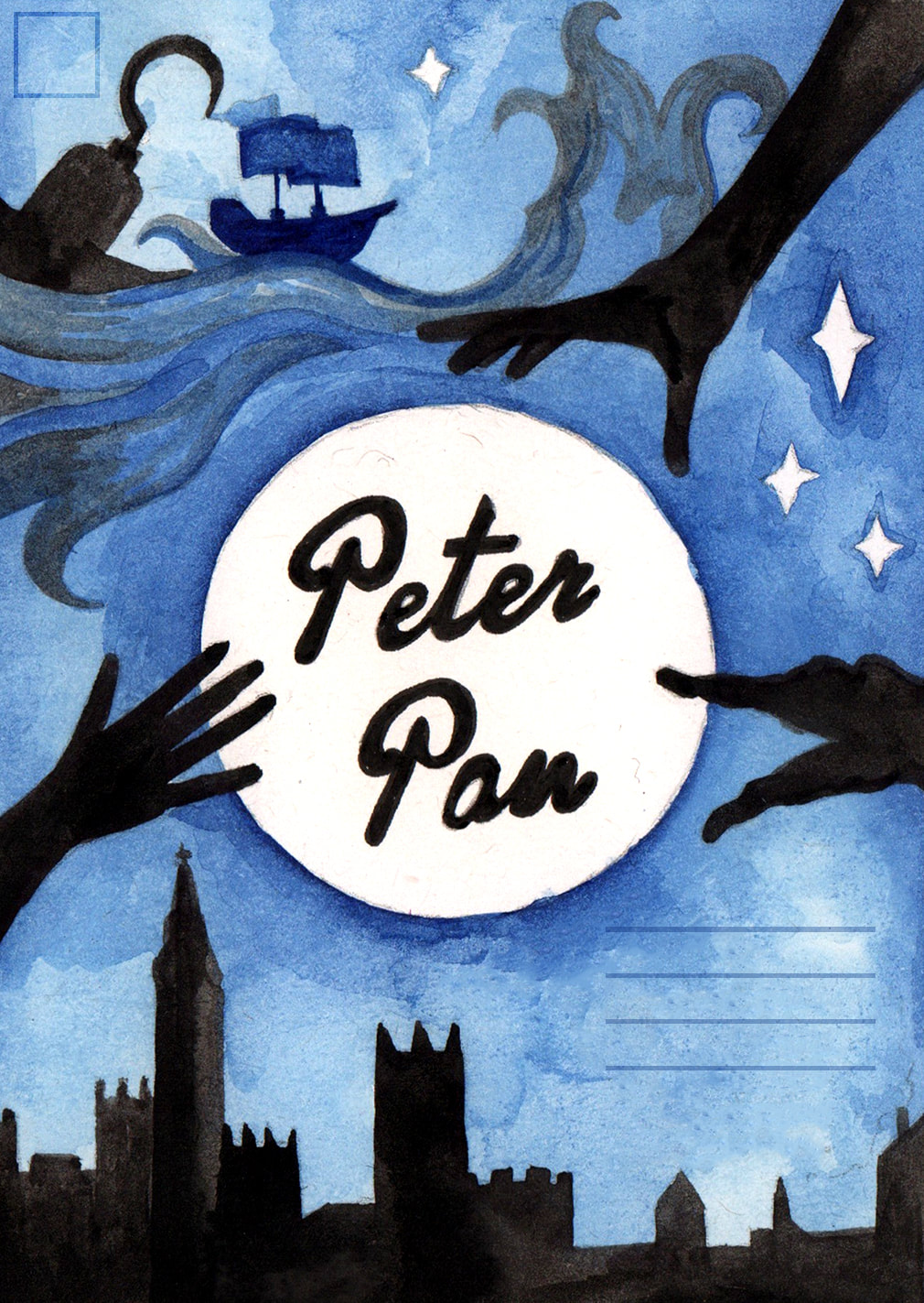 For the "Jolly Roger" development I tried to simplify the London skyline that is present in the water. I did really like the original boat that I had made using copic markers, however it looked more like a book cover than a theatre poster to me. Hence the reason why I decided to combine the two images. After testing how the marker and watercolour worked to create the appearance of water, I decided that I preferred the way that the watercolour looked. It was more fluidic which gave the piece more movement. However after these tests I decided that I didn't like the line art on the boat as it made the boat feel as though it was removed from it's environment.
